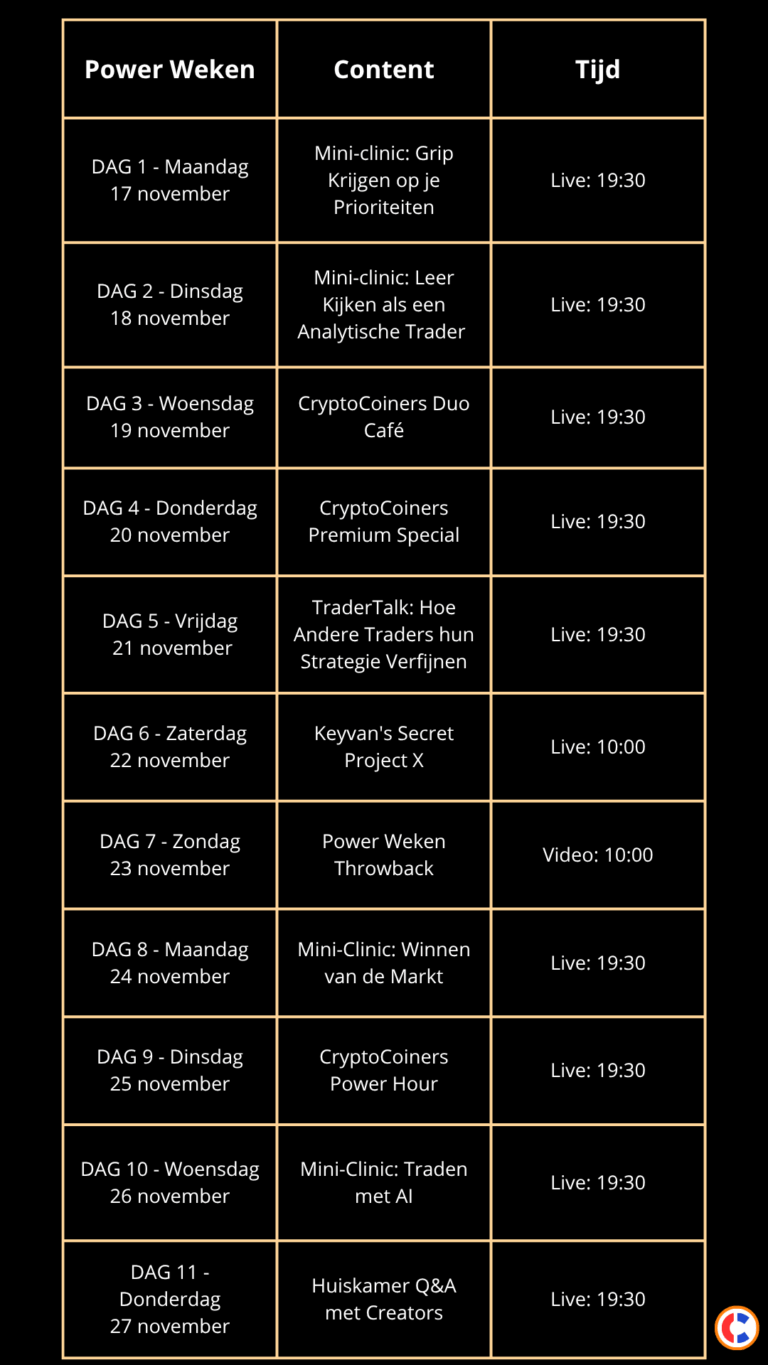 Hieronder vind je de CryptoCoiners Power Weken 2025 planning. Je ontvangt als Power Weken deelnemer elke dag een email met daarin informatie & uitleg over de content van die dag.